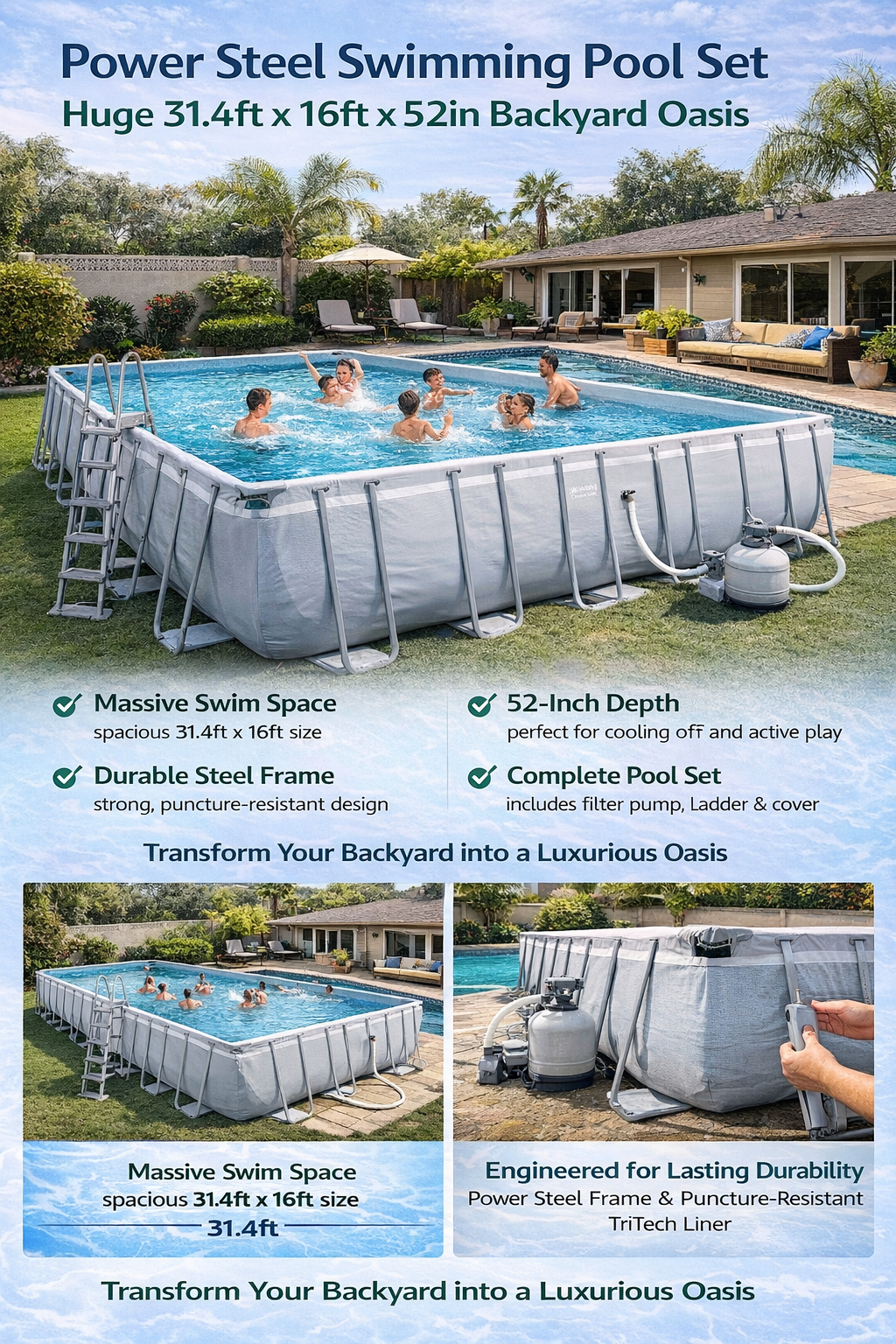 Power Steel Swimming Pool Set – 31.4ft x 16ft x 52in Backyard Oasis